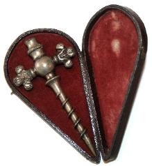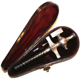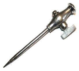 | This is an English Milne champagne tap with drop points. The idea was to insert the drop point within the bottom of the tap. Once the tap had completely inserted the cork, the spike would fall to the bottom of the bottle & the liquid could be drawn. When the drink had gone the spike would be fished out but many were lost, after all...once you've drunk a bottle of champagne chances are you'll forget to collect it. |