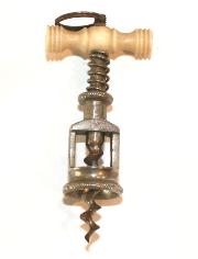Left: A wonderful miniature easer corkscrew measuring just under 2" & made with a beautiful turned bone handle. Designed to open small corked bottles such as perfume, ink & medicine. Right: A wonderful miniature spring assisted mechanical corkscrew that measures approximately 2". Once again this corkscrew was designed to open small corked bottles of liquid such as perfume, ink, medicine & poison.. |