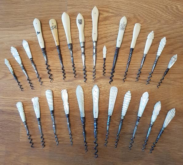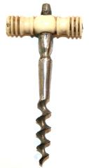 | This grouping above are more typically known as perfume corkscrew. The pretty design makes a clearer statement to justify the term. These corkscrews were clearly mass produced as so many have been found over the years by eager collectors. There's no doubt that they make a beautiful mini collection of corkscrews in their own right. Handles manufactured from Mother of Pearl, bone, ivory, silver, gold & tortoiseshell can all be found & the carving to the handles can be quite diverse & very beautiful. Victorian vanity sets would nearly always contain a corkscrew of this type. |
